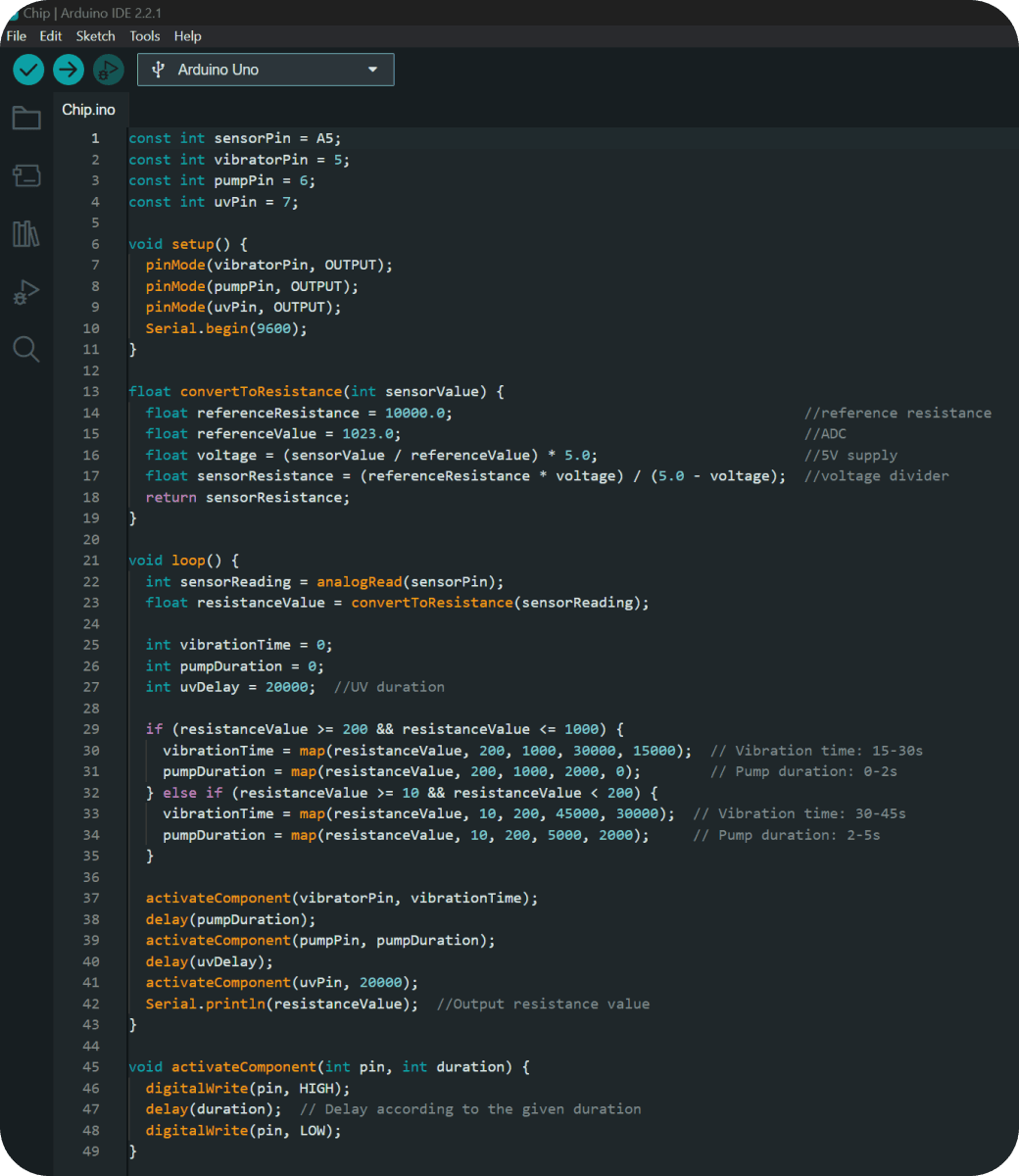 During this stage, I program the Arduino Uno R3 via Arduino IDE to orchestrate the turn-on sequence and regulate the timing of the ultrasonic vibrators, sanitizer pump, and UVC light to ensure a synchronized and effective hand hygiene process.